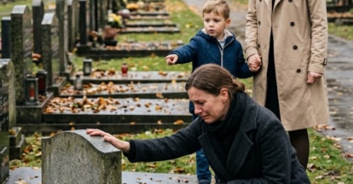 Berniukas, gal šešerių ar septynerių metų, laikė mamos ranką ir vis dar rodė į antkapį.